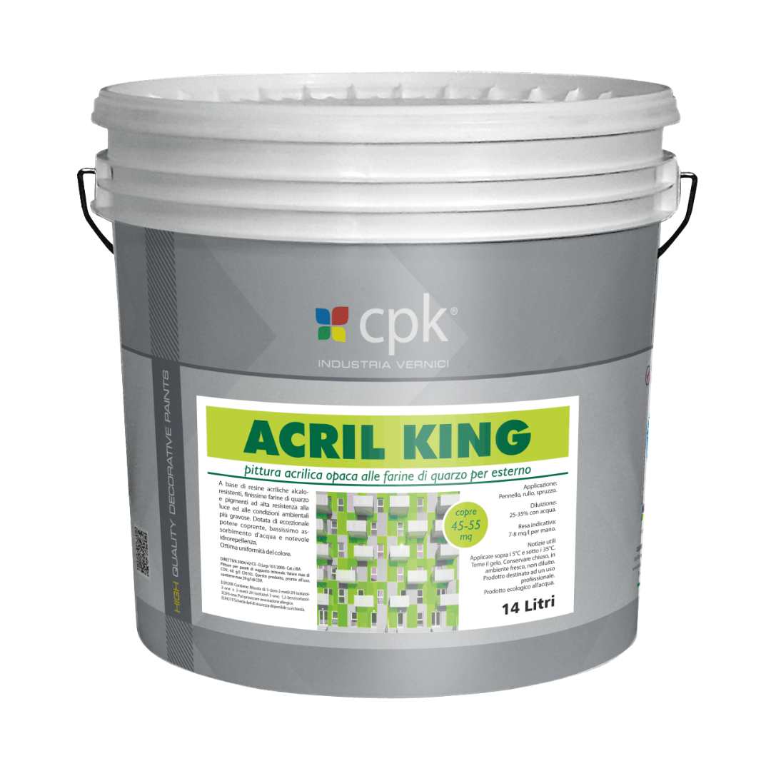 ACRIL KING è un rivestimento al quarzo per esterni a base di selezionate resine acriliche in dispersione acquosa alcali-resistenti, farine di quarzo finissime e pigmenti inorganici ad alta resistenza alla luce solare e alle condizioni ambientali più gravose. È dotato di eccezionale potere coprente, bassissimo assorbimento d’acqua e notevole idrorepellenza.