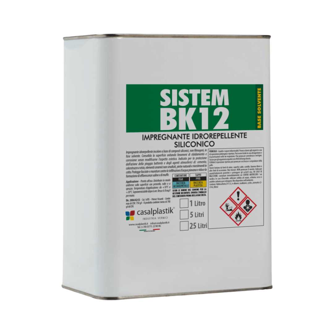 SYSTEM BK 12 è un impregnante idrorepellente siliconico trasparente, formulato per la protezione di superfici minerali esterne come calcestruzzo, cotto e pietra. Il prodotto penetra in profondità nel supporto, consolidandolo e riducendo l’assorbimento dell’acqua senza alterarne la naturale traspirabilità.